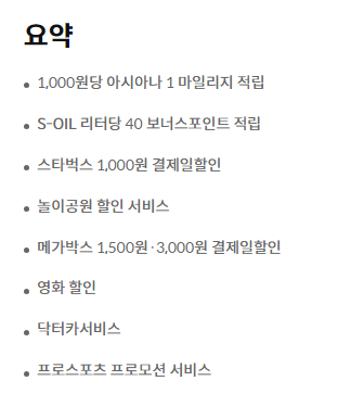 아시아나 마일리지 적립 외에도 다양한 혜택이 있습니다. 에스오일 (S-OIL) 리터 당 40 보너스포인트 적립, 스타벅스 1,000원 결제일 할인 등 다양한 혜택을 확인할 수 있습니다.