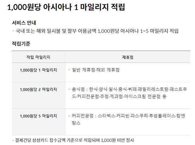 아시아나 마일리지 적립에 관련된 내용만 자세히 보면, 기본적으로는 1,000원 당 1 마일리지이며, 커피전문점 (스타벅스, 커피빈, 파스쿠찌, 투썸플레이스, 탐앤탐스)에서 카드를 사용하면 1,000원 당 5 마일리지가 적립됩니다.