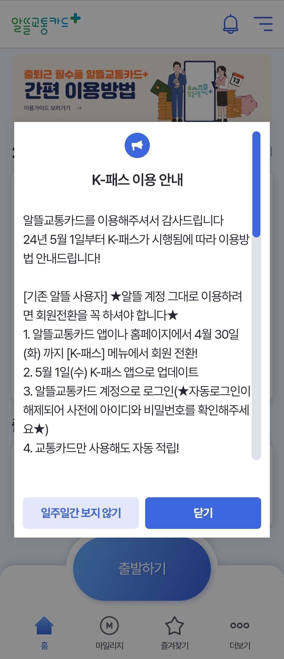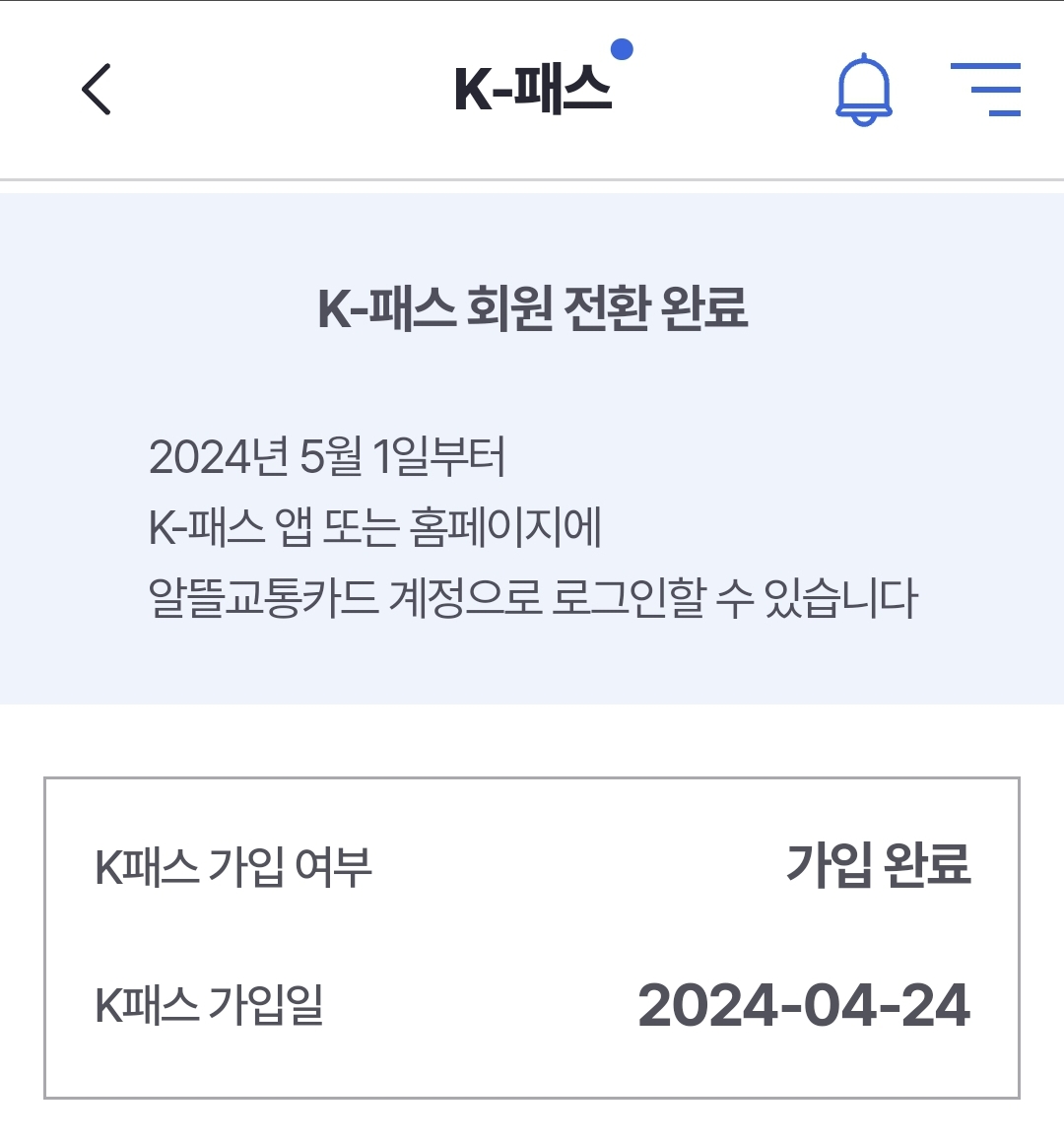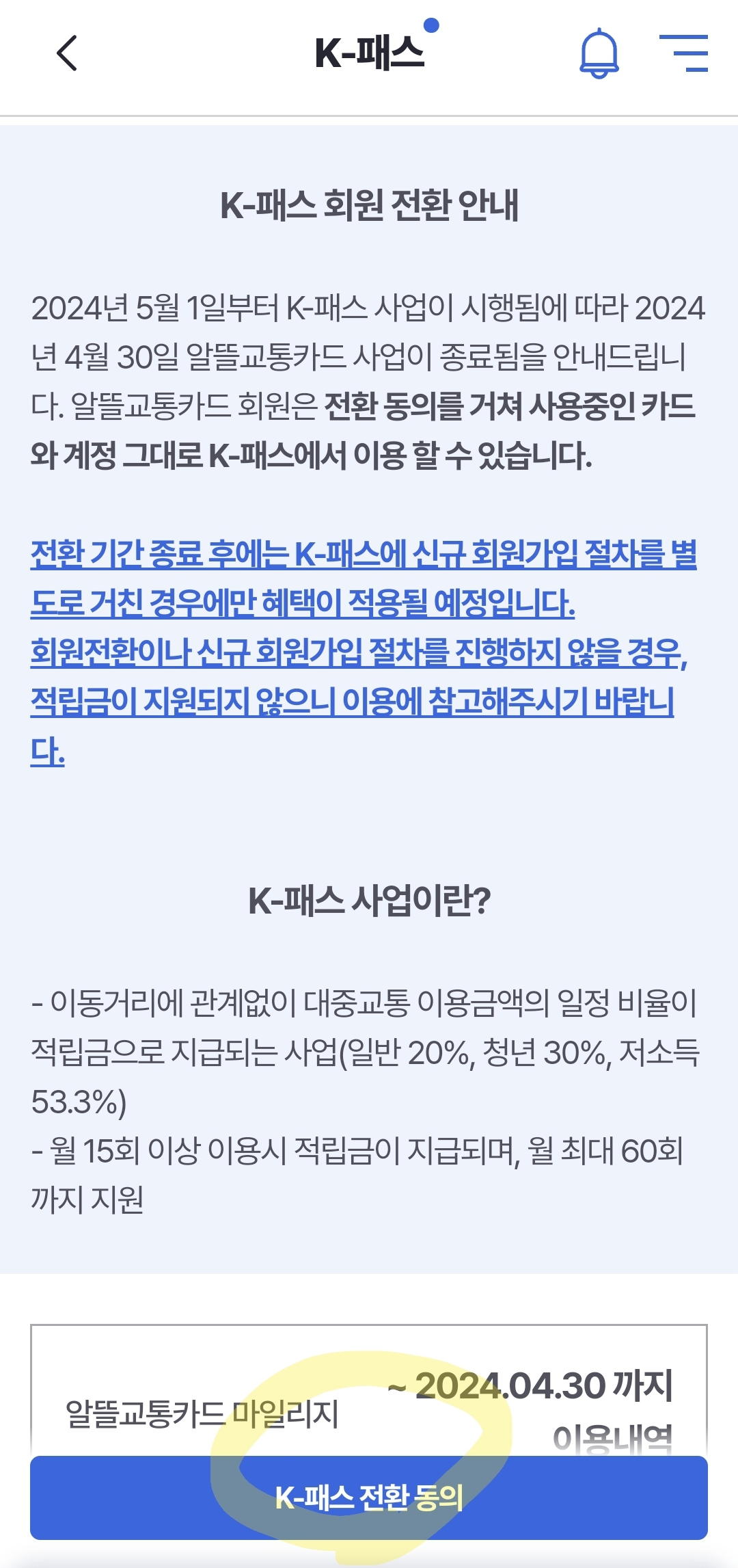 24년 5월 1일부터 K-패스가 시행됨에 따라 기존 알뜰교통카드 회원들이 계정을 그대로 이용하려면 "회원 전환"을 꼭 해야 합니다. 5월 1일 이후에 K-패스로 이용 시에는 K-패스 카드를 발급받고, K-패스 홈페이지 혹은 앱에서 회원가입 및 이용이 가능하다고 합니다. K-패스 앱 또한 5월 1일 이후에 이용이 가능합니다.