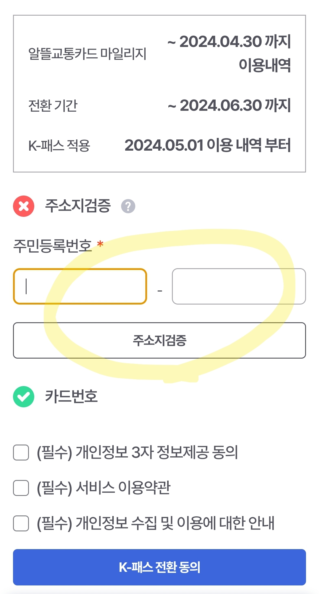 주소지 검증을 위해 주민등록번호 입력을 진행합니다. [주소지검증] 버튼을 클릭하면 손쉽고 간편하게 인증이 완료됩니다. 하단에 있는 필수 항목에 모두 체크를 한 뒤 [K-패스 전환 동의] 버튼을 눌러 진행합니다.