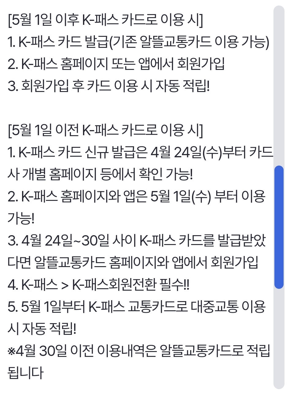 K-패스 발급 기간은 4월 24일부터이며, 이 날부터 카드사 개별 홈페이지에서 신규 발급 확인이 가능합니다. 4월 24일부터 4월 30일 사이에 K-패스를 발급받았다면 K-패스 홈페이지와 앱이 아직 오픈되지 않았기 때문에 알뜰교통카드 홈페이지/앱에서 가입 후 회원 전환을 하여 사용하시면 됩니다.