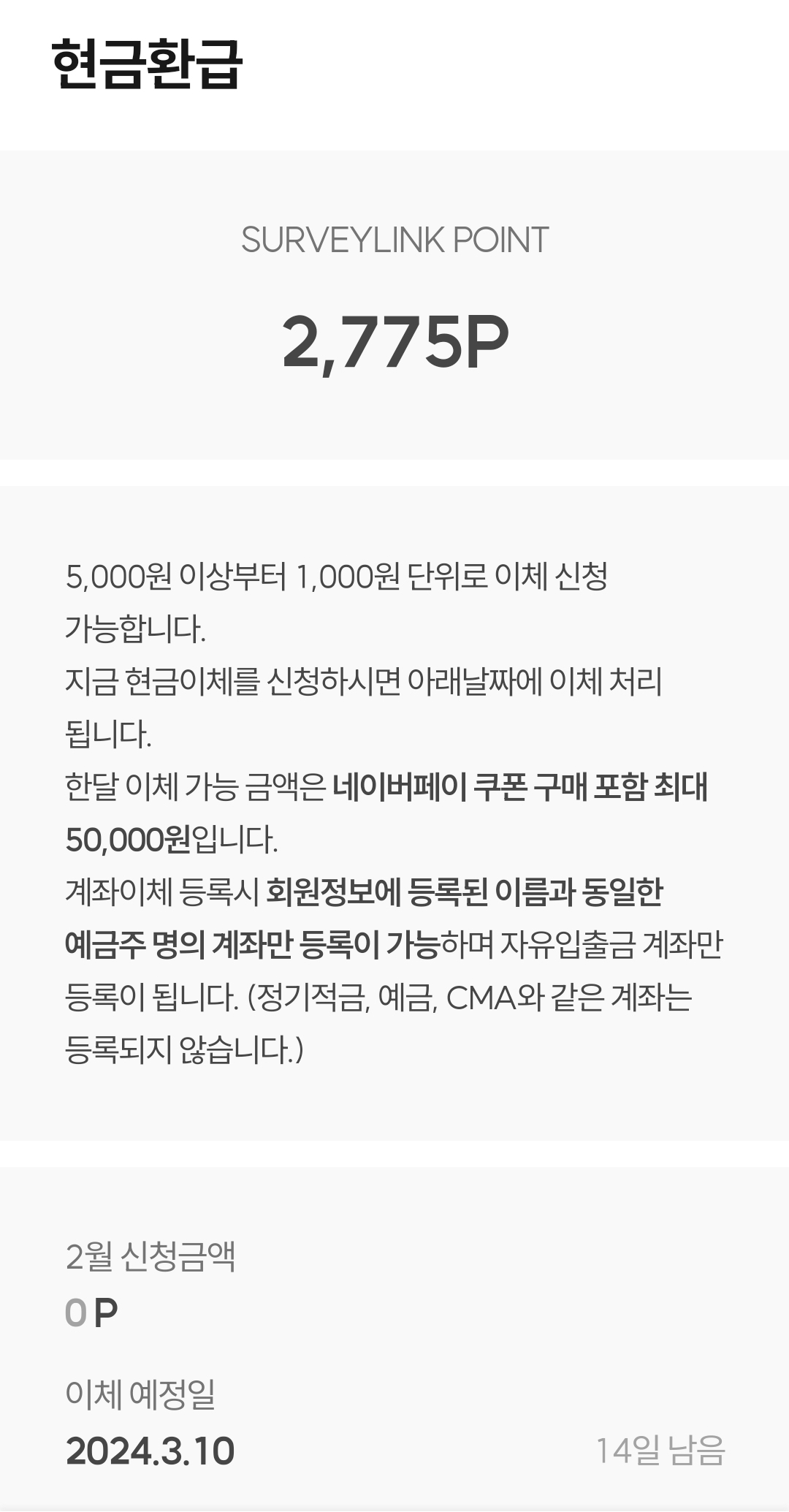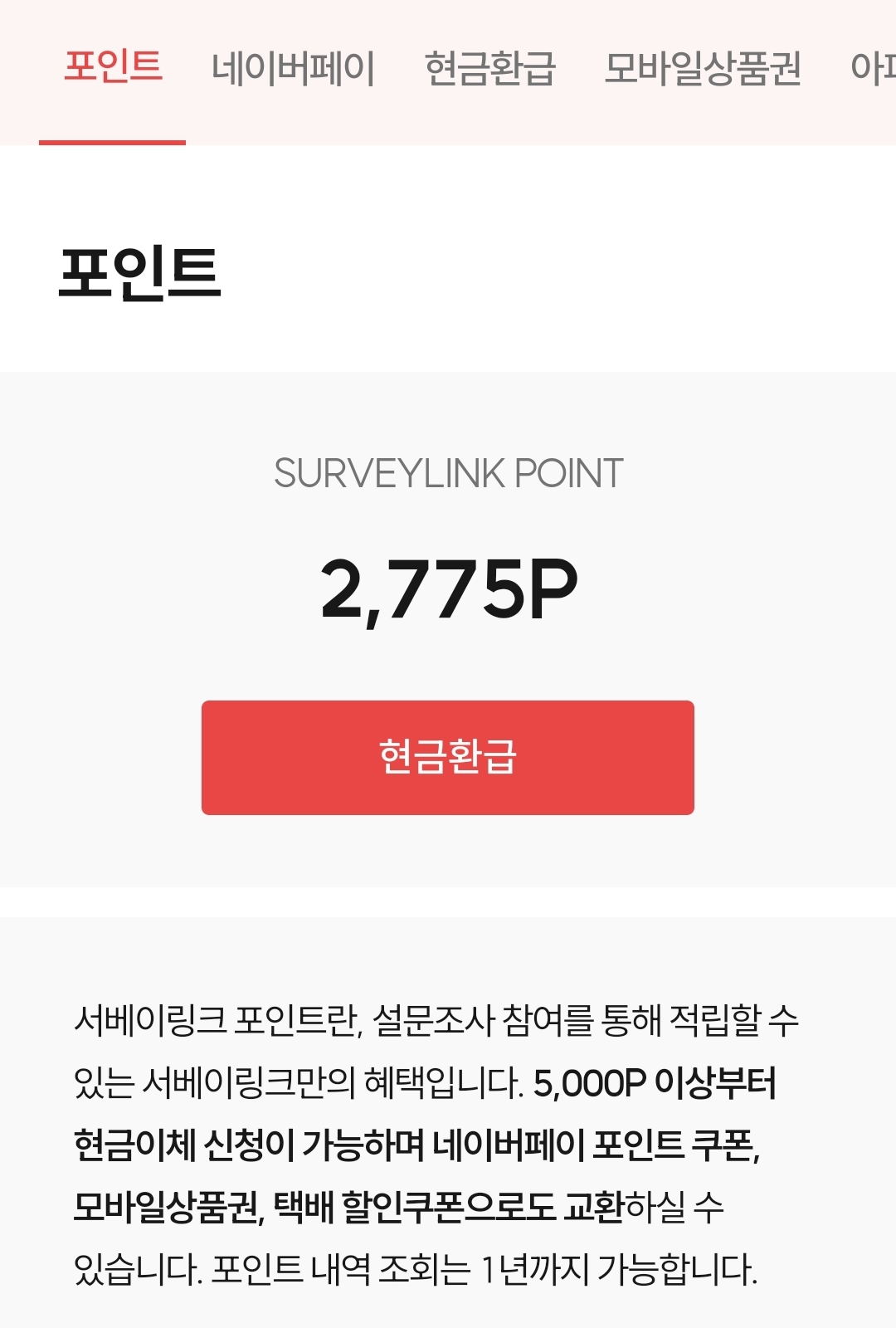 서베이링크를 두 달 정도 사용했는데, 총 7,775포인트를 적립했습니다. 최근에 5천 포인트를 현금으로 환급받아 2,775 포인트가 남아있습니다. 다른 설문조사 앱테크 사이트에 비해 조사 종류가 많지는 않지만, 현금 환급을 5천원부터 천 원 단위로 할 수 있어서 장벽이 낮게 느껴져 좋았습니다. 네이버페이나 상품권으로 교환할 수 있는 것도 유용하게 느껴 서베이링크를 추천드립니다.