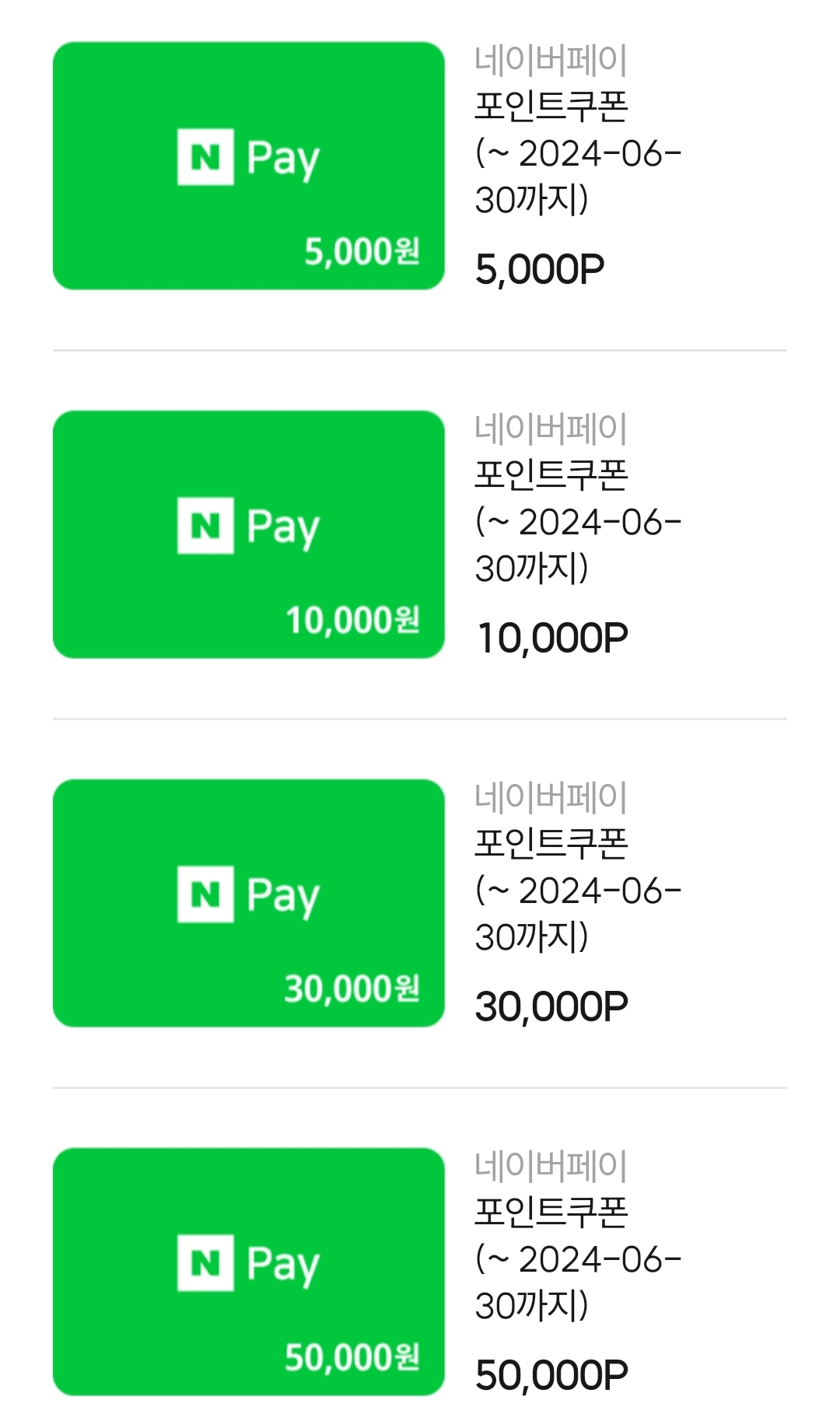 - 네이버페이 포인트쿠폰: 5천원, 1만 원, 3만 원, 5만 원권을 구매할 수 있습니다.