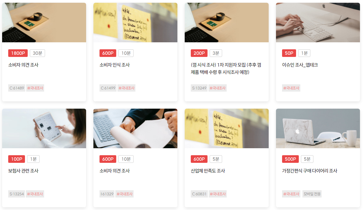 가입할 때 등록하는 기본 정보를 통해 여러 가지 조사가 제안됩니다. 보통 소비자 만족도/인식 조사가 가장 많고, 그 외에도 브랜드 인식도 조사, 사회 문제 조사 등이 있습니다.