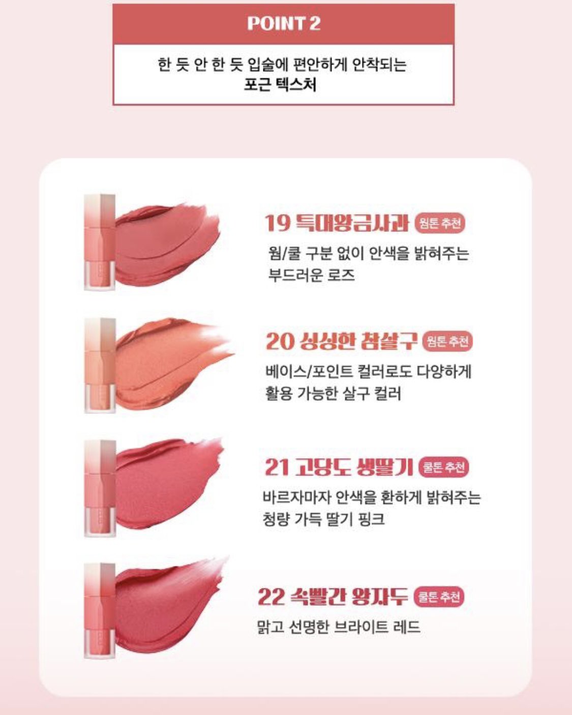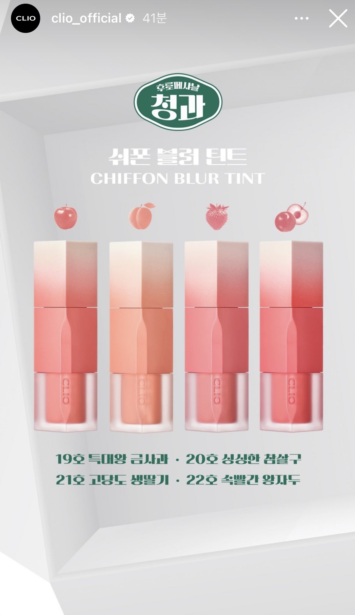 클리오 후로페샤날 청과 에디션 쉬폰 블러 틴트는 19호부터 22호까지의 4개의 신컬러가 출시되며, 이는 활기 넘치는 야외 마켓의 싱그러운 과일 컬러에서 영감을 받은 총 4가지 색상입니다. 겨울이 끝나고 봄이 다가옴이 물씬 느껴지는 산뜻한 컬러들이네요.