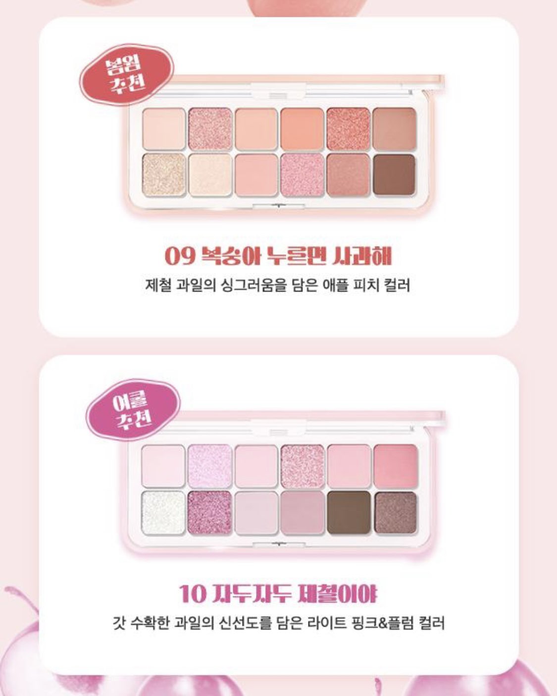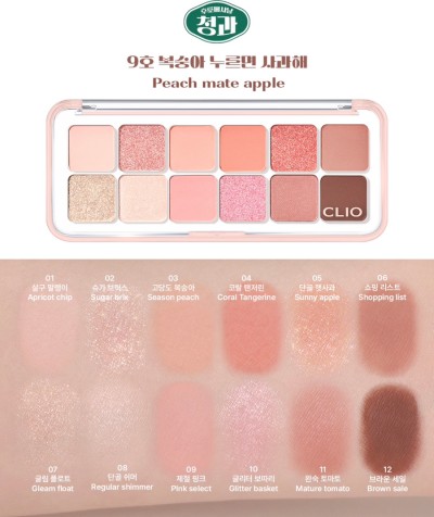 클리오 후로페샤날 청과 에디션의 프로 아이 팔레트 에어 '09 복숭아 누르면 사과해' 컬러는 웜톤 베이스의 12가지 컬러가 포함된 아이 팔레트 입니다. 극웜톤부터 미지근한 톤까지 사용할 수 있도록 중간중간에 쿨한 기운이 섞인 컬러도 있네요.