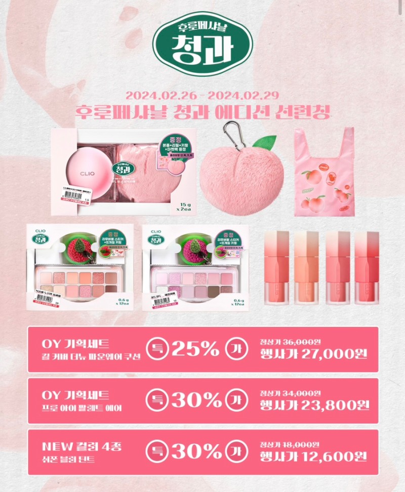 또한 클리오 후로페샤날 청과 에디션의 선런칭 기획 세트가 할인가에 제공됩니다. 선런칭 기획 세트의 할인 기간은 2/26~2/29, 총 4일동안 진행됩니다.