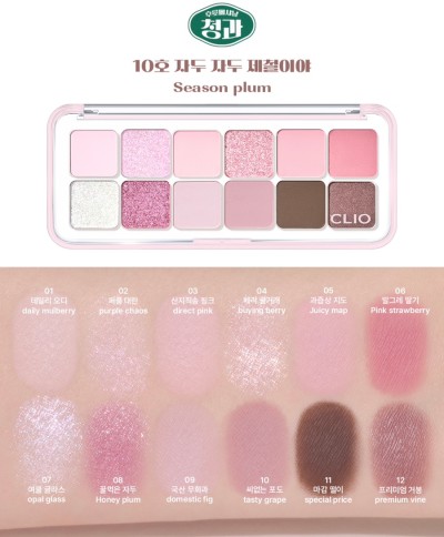 클리오 후로페샤날 청과 에디션의 프로 아이 팔레트 에어 '10 자두 자두 제철이야' 컬러는 여쿨추천 컬러 팔레트로, 여리여리한 쿨톤 핑크빛이 잘 어울리는 분들에게 추천입니다. 짙은 고동색 브라운이 하나 있어서 활용도를 높였지만, 중간톤이 없는 점은 아쉽네요. 어차피 여쿨에게 중간톤의 활용도가 높지 않음을 감안한 점이 아닐까 싶기도 합니다. 이번 클리오 아이 팔레트에는 여리여리한 펄보다는 존재감이 꽤 있는 펄이 많이 있네요.