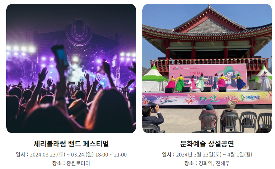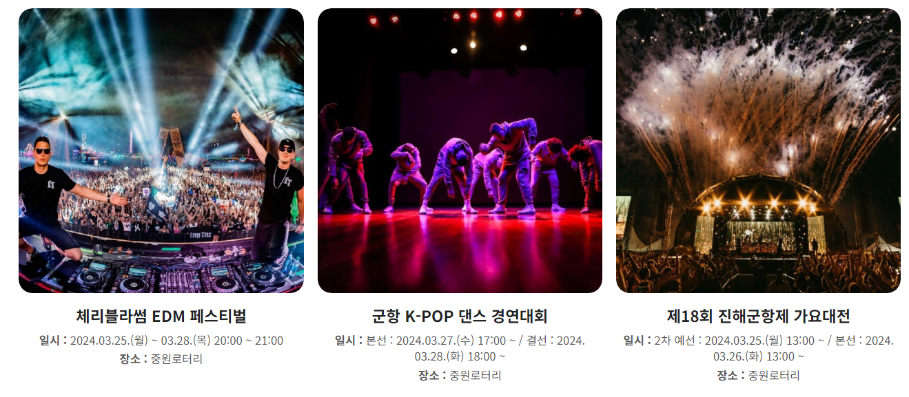 그 외에도 체리블라썸 EDM 페스티벌, 군항 K-POP 댄스 경연대회, 진해군항제 가요대전, 밴드 페스티벌, 문화예술 상설 공연 등이 있습니다. 다양한 일정 정보는 진해 군항제 홈페이지에서 확인 가능합니다.
